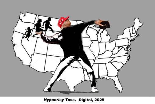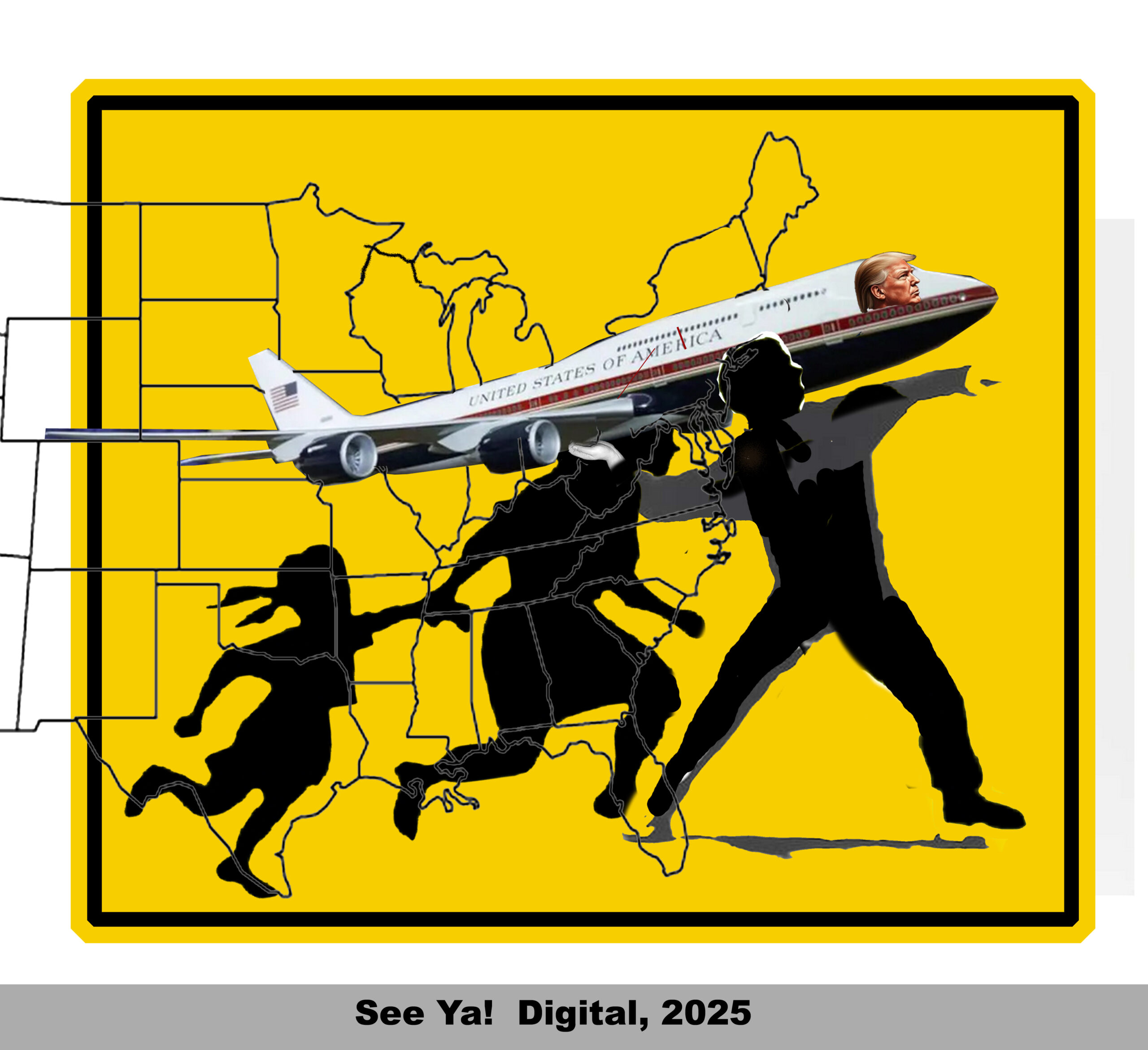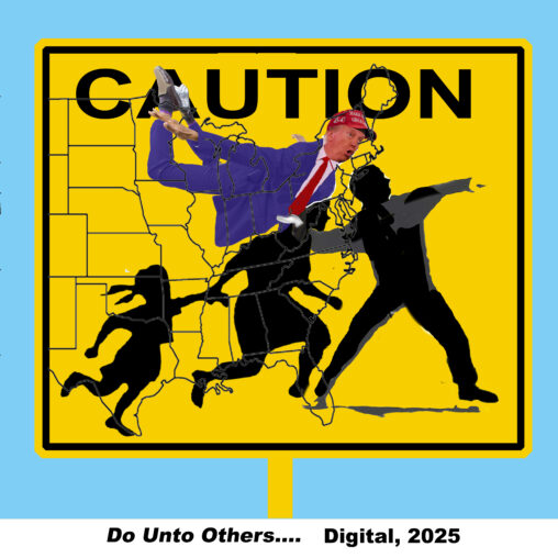 Yeah, that’s graffiti artist Banksy’s “flower toss” man, with the caution immigrants’ road sign icons subbing for the flowers. My idea evolved from a sub sandwich, which was…